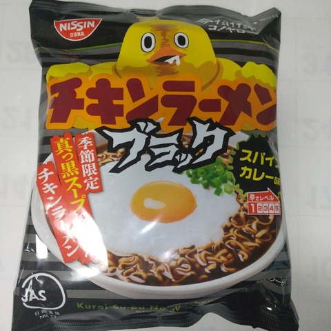 日清辛さレベルは1これも新たなチキンラーメンの形か卵を投入するってのはお決まりの食べ方だが、これは黒いけどカレー味である。しかしこのカレー味···