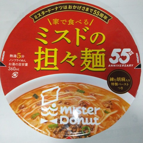 ミスタードーナツ55周年記念商品製造所エースコック株式会社万人向けの優しい・・・いやスープは赤いけど殆ど辛さのない担々麺だ。シビカラがなくて個···